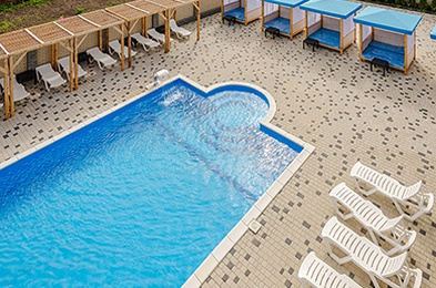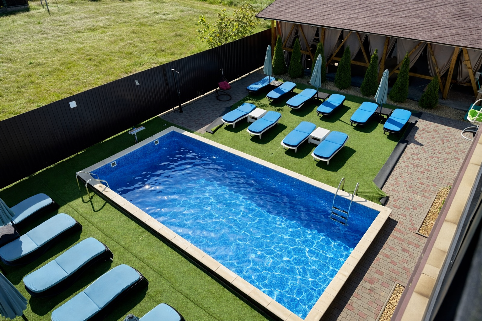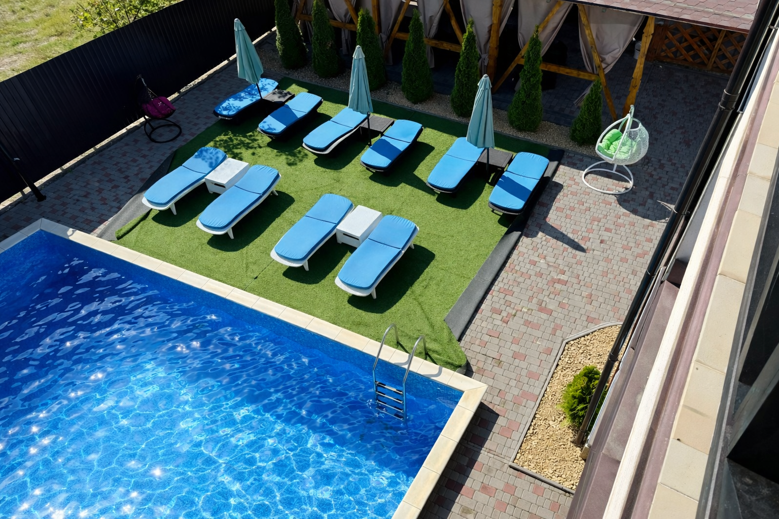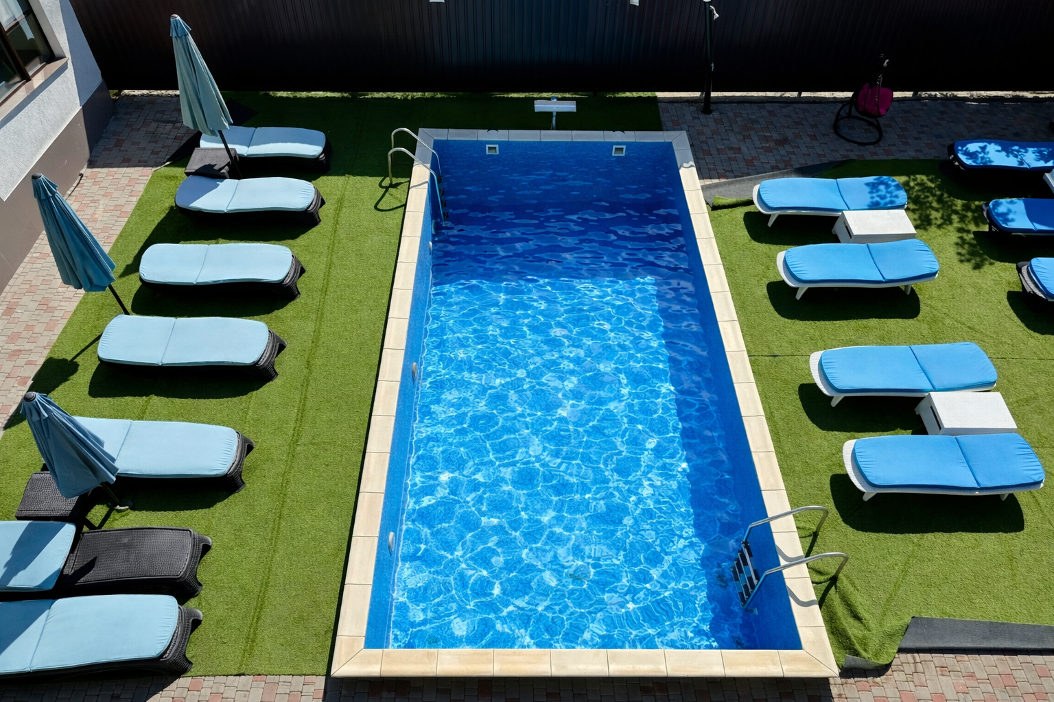 Усі номери виходять у тихий внутрішній двір із басейном, що створює атмосферу приватності та спокою.